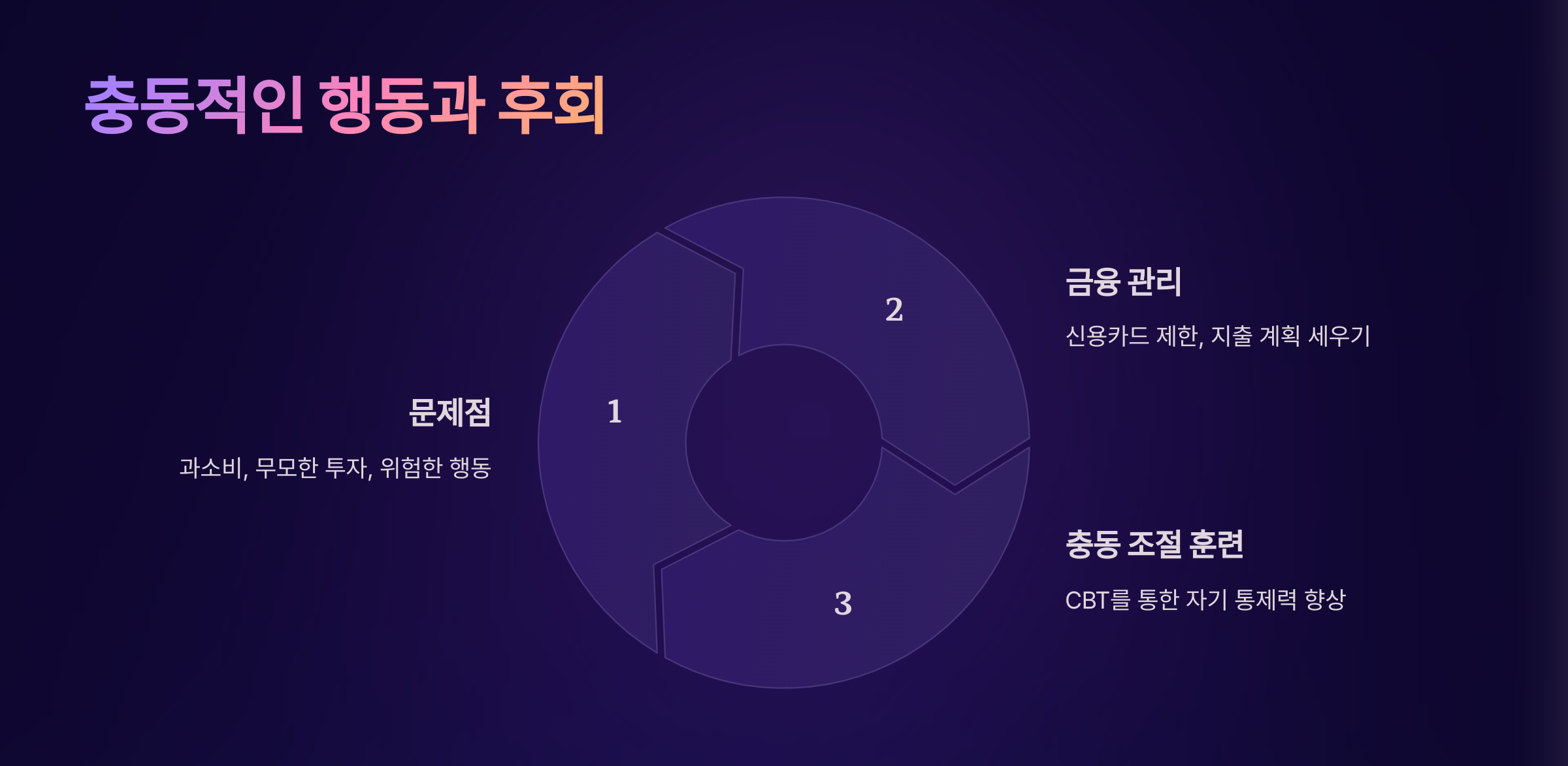 - 충동 조절 훈련: CBT(인지행동치료)를 통해 충동 조절력을 기를 수 있습니다.