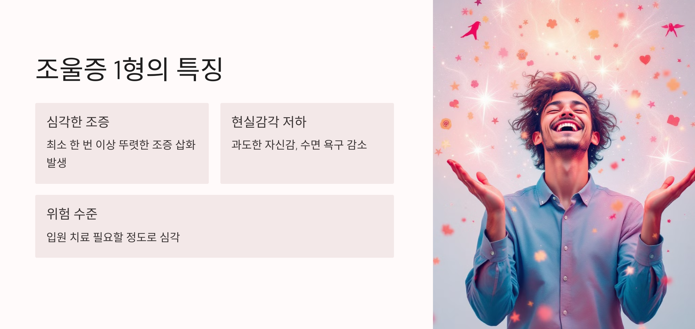 조울증은 완치보다는 관리가 핵심인 만성질환이다. 그러나 올바른 치료와 환경이 뒷받침된다면, 환자는 건강하고 안정된 삶을 유지할 수 있다. 조울증 1형과 2형의 차이를 정확히 알고, 각자에게 맞는 대처 전략을 세우는 것이 회복의 첫걸음이다.