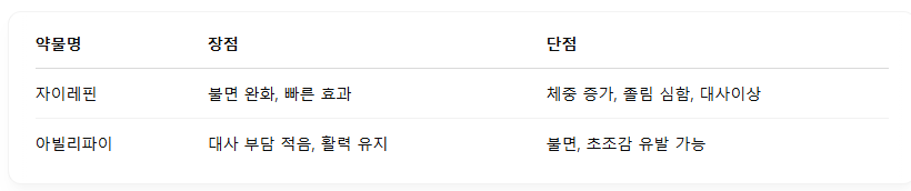 - 자이레핀은 도파민 차단 중심이라 졸림과 무기력감이 흔하지만,